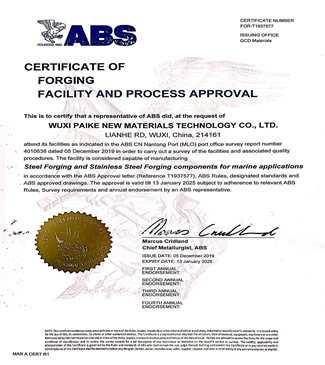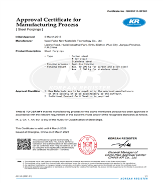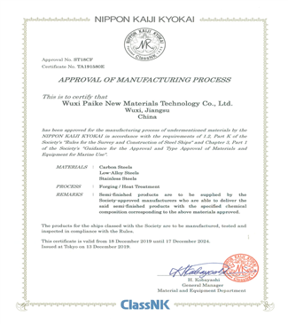 公司拥有发明专利56项,通过了AS9100航空国防质量管理体系认证、ISO9001质量体系认证、ISO14001环境管理体系认证、OHSAS18001职业健康安全管理体系认证,取得了特种设备制造资格许可证(压力管道元件),以及ABS/CCS/DNVGL/LR/KR/NK/RINA/BV/RS世界九大主要船级社认证和欧盟TUV认证,根据客户特殊过程管理要求,还通过了热处理/无损检测/试验室的NADCAP认证和热处理/无损检测的TPG认证。